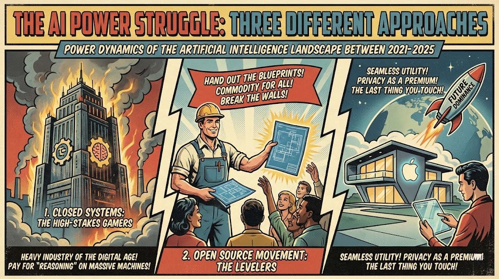 Between 2021 and 2025, this wasn’t just some technical evolution. It was a gold rush that turned into a permanent occupation. AI stopped being a novelty and became the floor everyone has to walk on. The players on the field have split into three camps, and each one is betting their entire existence on a different version of the future.